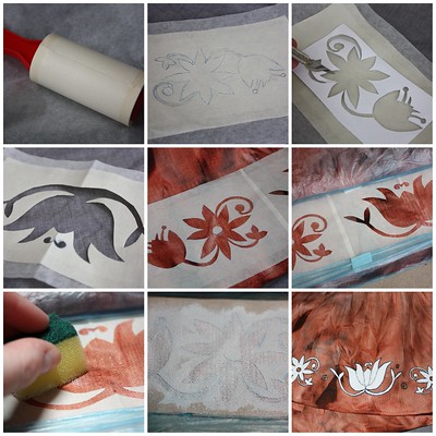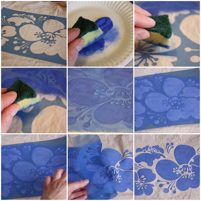 - Trüki muster ettevaatlikult tupsutades švammi või tugeva pintsliga. Kasuta värvi pigem tagasihoidlikult, et takistada värvi imbumist šablooni äärte alla.