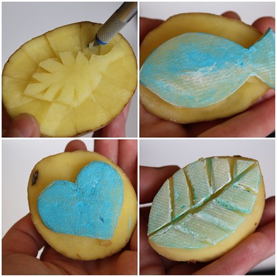 Ju lasteaiast või algkoolist tuttav kartulitükk on kangakaunistamiseks väga tänuväärne tehnika. Lõika kujundid välja, lase natuke lõikepinnal kuivada, kata värviga ja trüki!